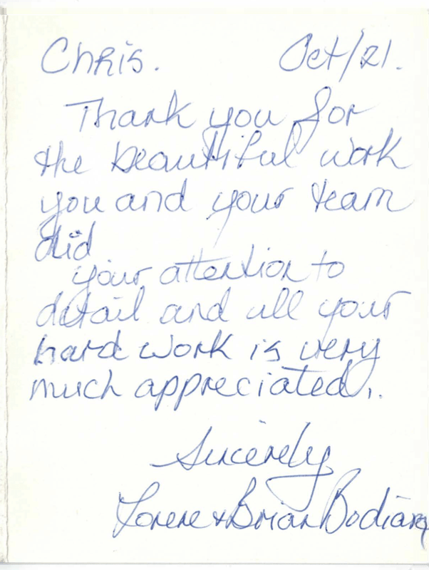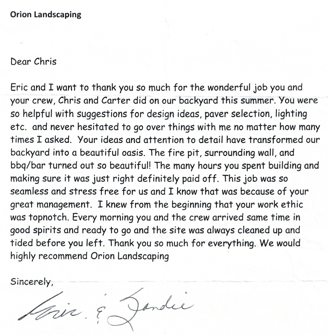 "Thank you for coming back this year to re-design our backyard. Although we were thrilled with the design from last year, we wanted to enlarge our stairway and hot tub area. Needless to say, we love it. You knew just what to do, and you did a fantastic job! As always, it was a pleasure having you work for us. Please feel free to use us as a reference in the future. Good luck in all your future business endeavors. I am sure Orion Landscaping will continue to be a tremendous success given your positive attitude, your strong work ethic, and your desire to make things perfect. Without a doubt, you are a master designer and superior craftsman and excellent bricklayer."
